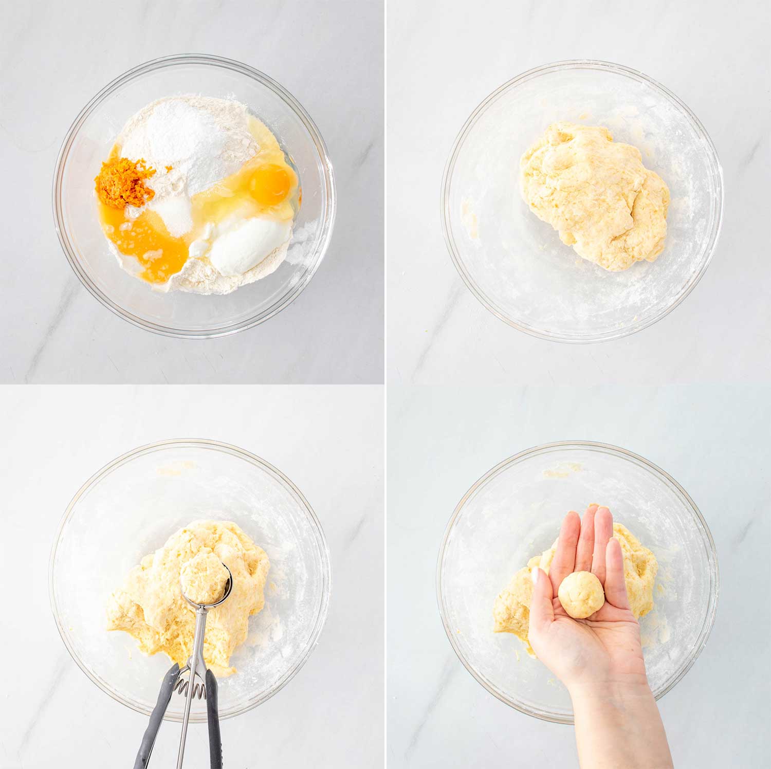 FORMEAZA ALUATUL : Amestecă toate ingredientele într-un bol până obții un aluat moale, apoi formează gogoșile cu mâna sau cu lingura.