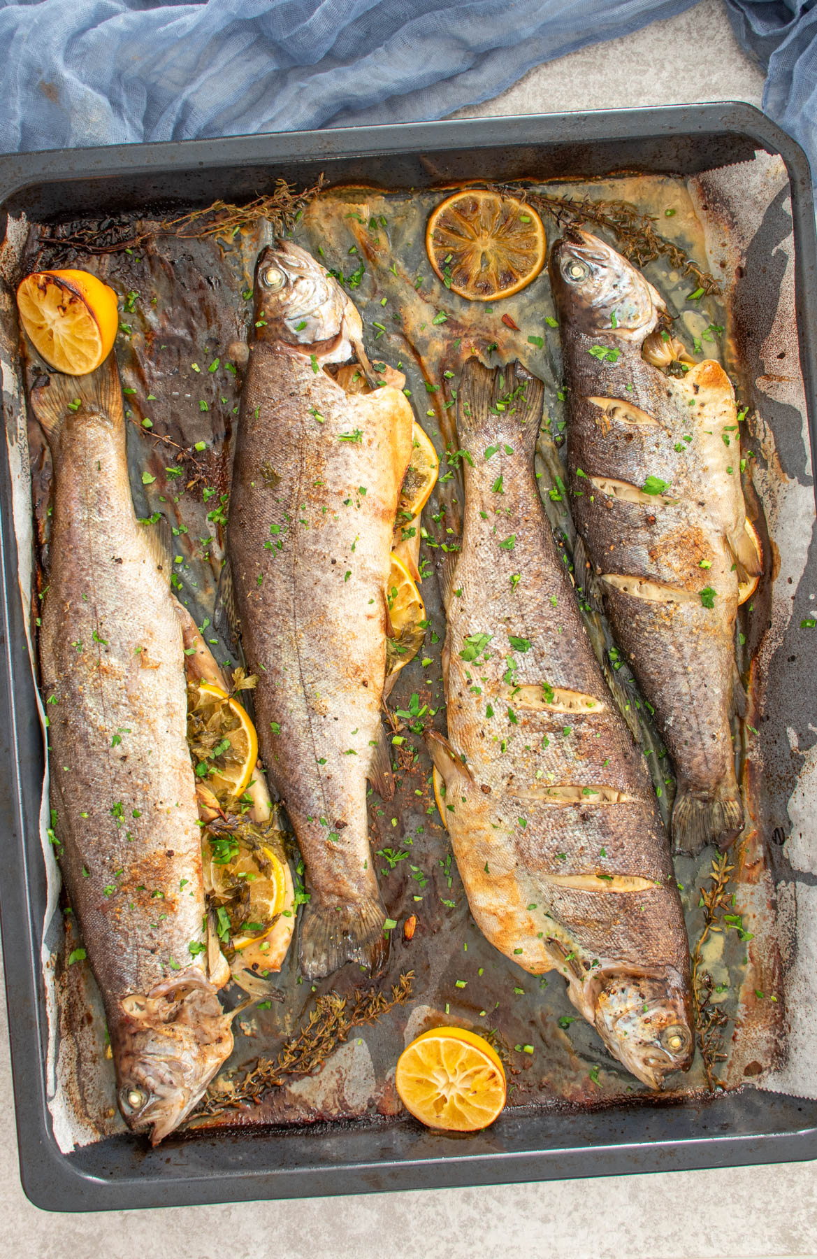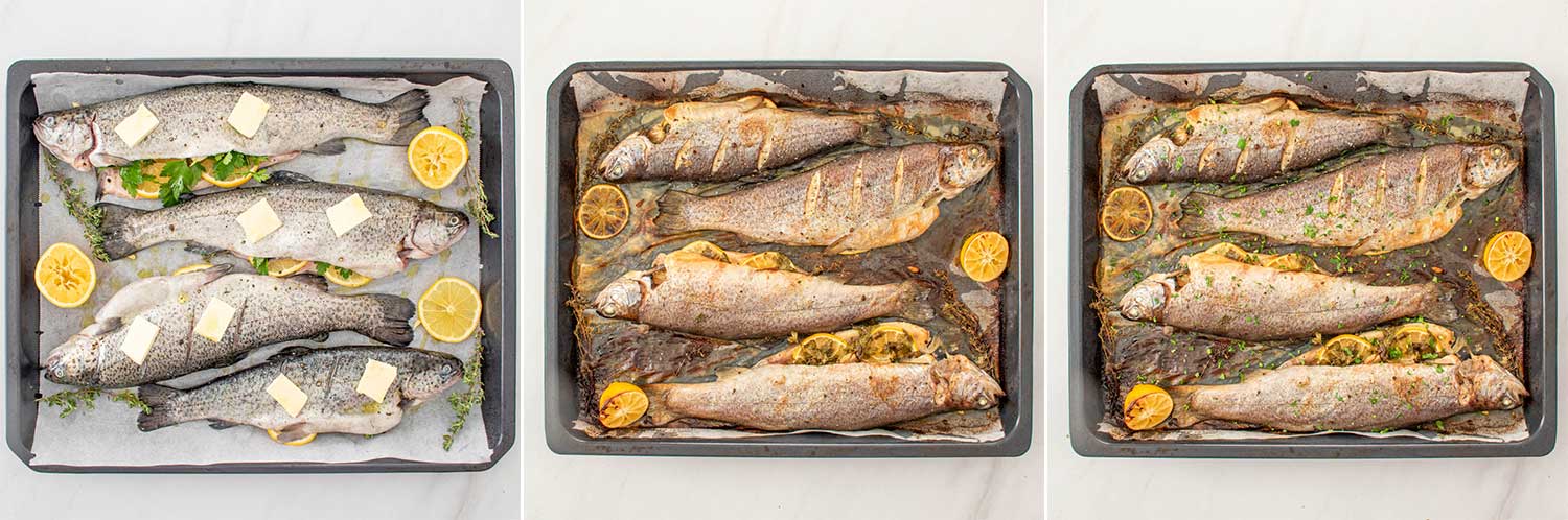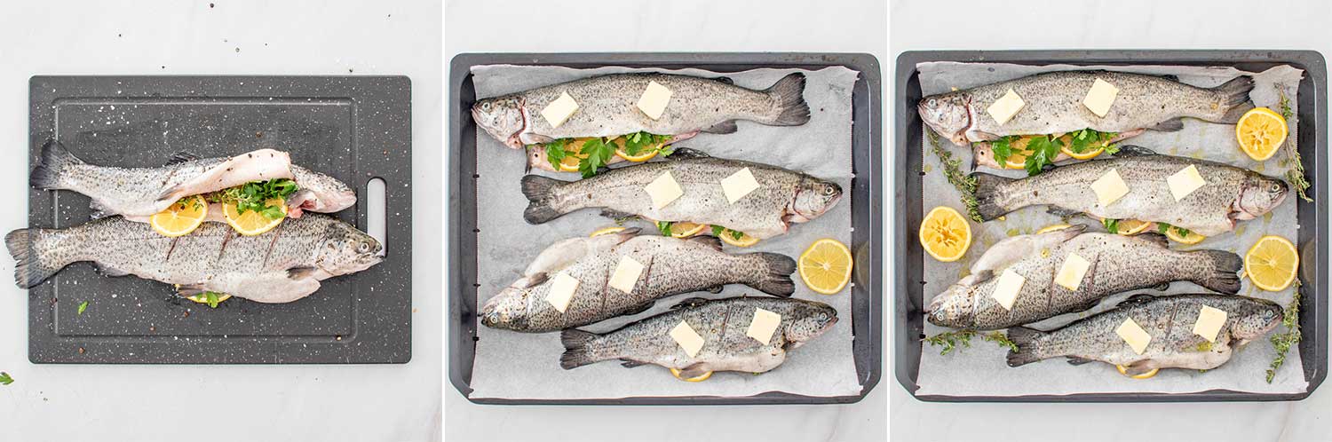 - Aseaza pastravii intr-o tava tapetata cu hartie de copt.