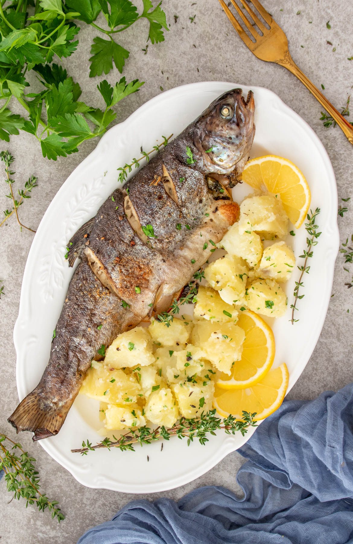 PASTRAV : Ingredientul principal al rețetei. Are o carne fragedă, delicată și un gust curat, care nu necesită multe condimente. Gătit corect, păstrăvul rămâne suculent și se desprinde ușor de pe os.