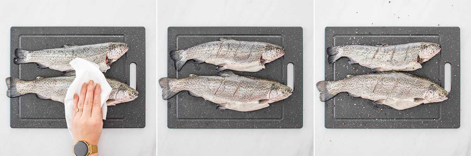 După spălare, șterge păstrăvul cu prosop de hârtie. Astfel, condimentele aderă mai bine și pielea se rumenește frumos. - Condimentează simplu, ca să păstrezi gustul peștelui