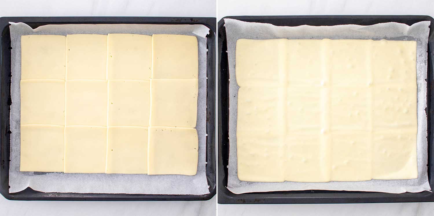 - Preîncălzește cuptorul la 180°C. Așază feliile de cașcaval într-o tavă mare și dă-le la cuptor timp de 5 minute, doar cât să se înmoaie ușor.