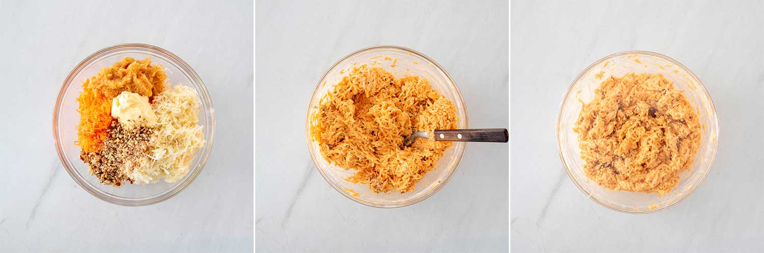 - Intr-un castron mare, adauga telina, morcovii, marul, maioneza si nuca macinata. Amestecă bine până când compoziția devine omogenă.