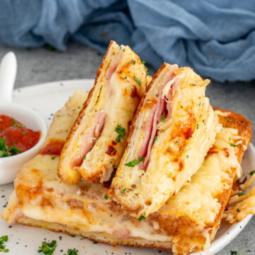 Sendvișuri gratinate cu pâine moale îmbibată în ou, straturi generoase de șuncă și cașcaval, acoperite cu mozzarella topită și parfumate cu oregano, rumenite perfect la cuptor până devin aurii și irezistibile.
