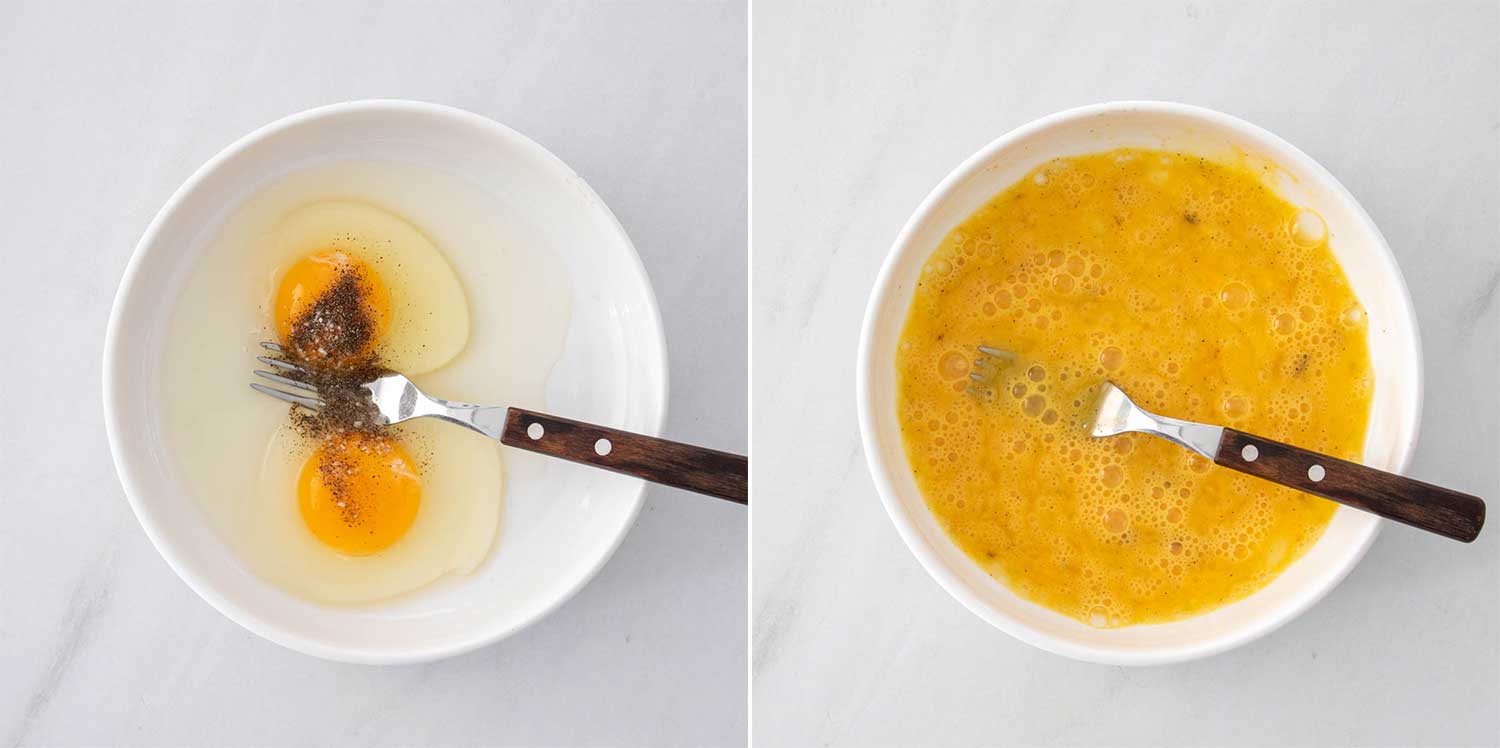 - Într-un bol, bate ouăle cu sare și piper.