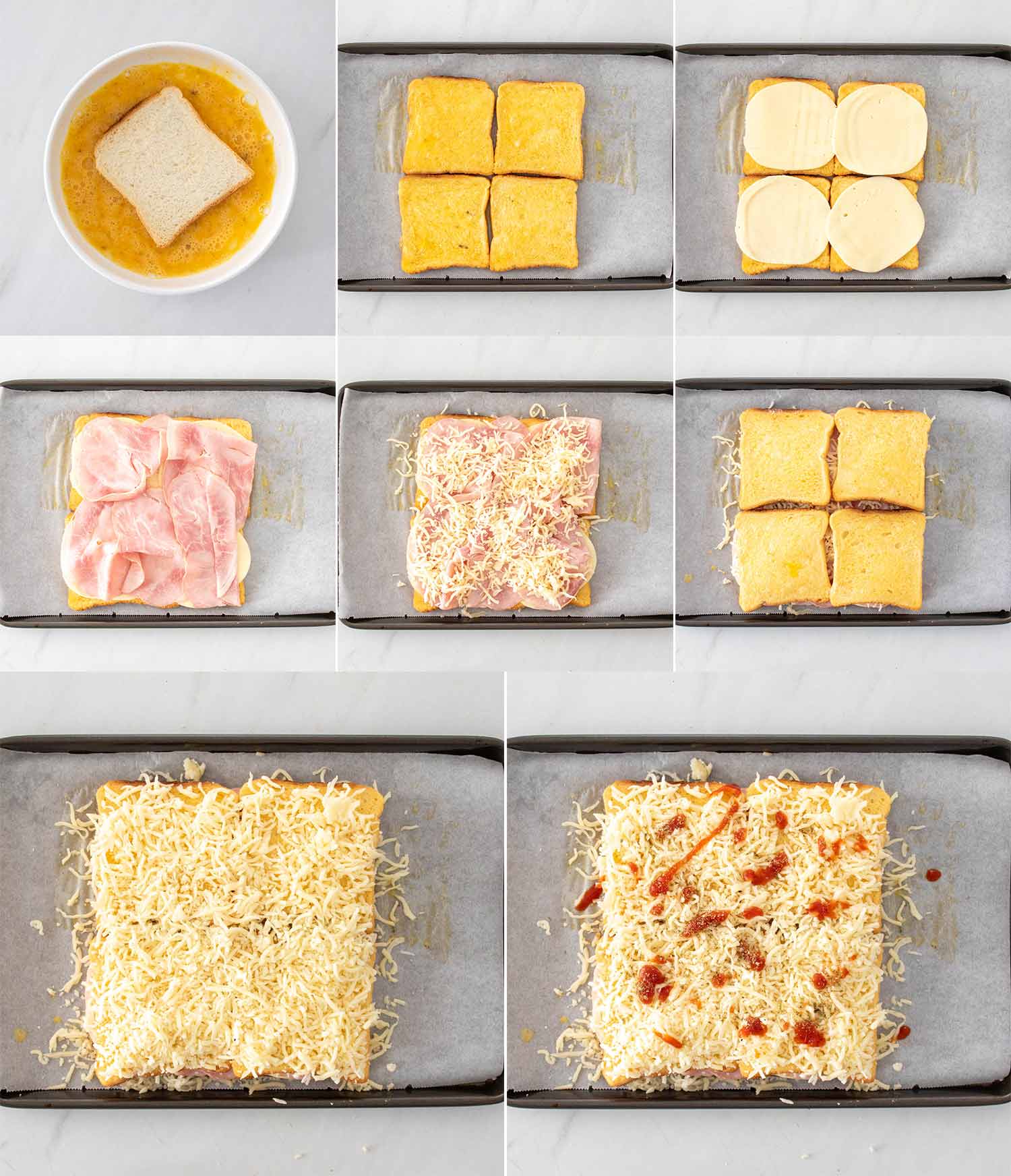 ASAMBLEAZA SENDVISURILE : Treci fiecare felie de pâine toast prin amestecul de ou, fără a le lăsa să stea prea mult. Așază 4 felii într-o tavă tapetată cu hârtie de copt, apoi adaugă șunca și feliile de cașcaval. Acoperă cu celelalte felii de pâine date prin ou, apoi presară mozzarella rasă și oregano deasupra.