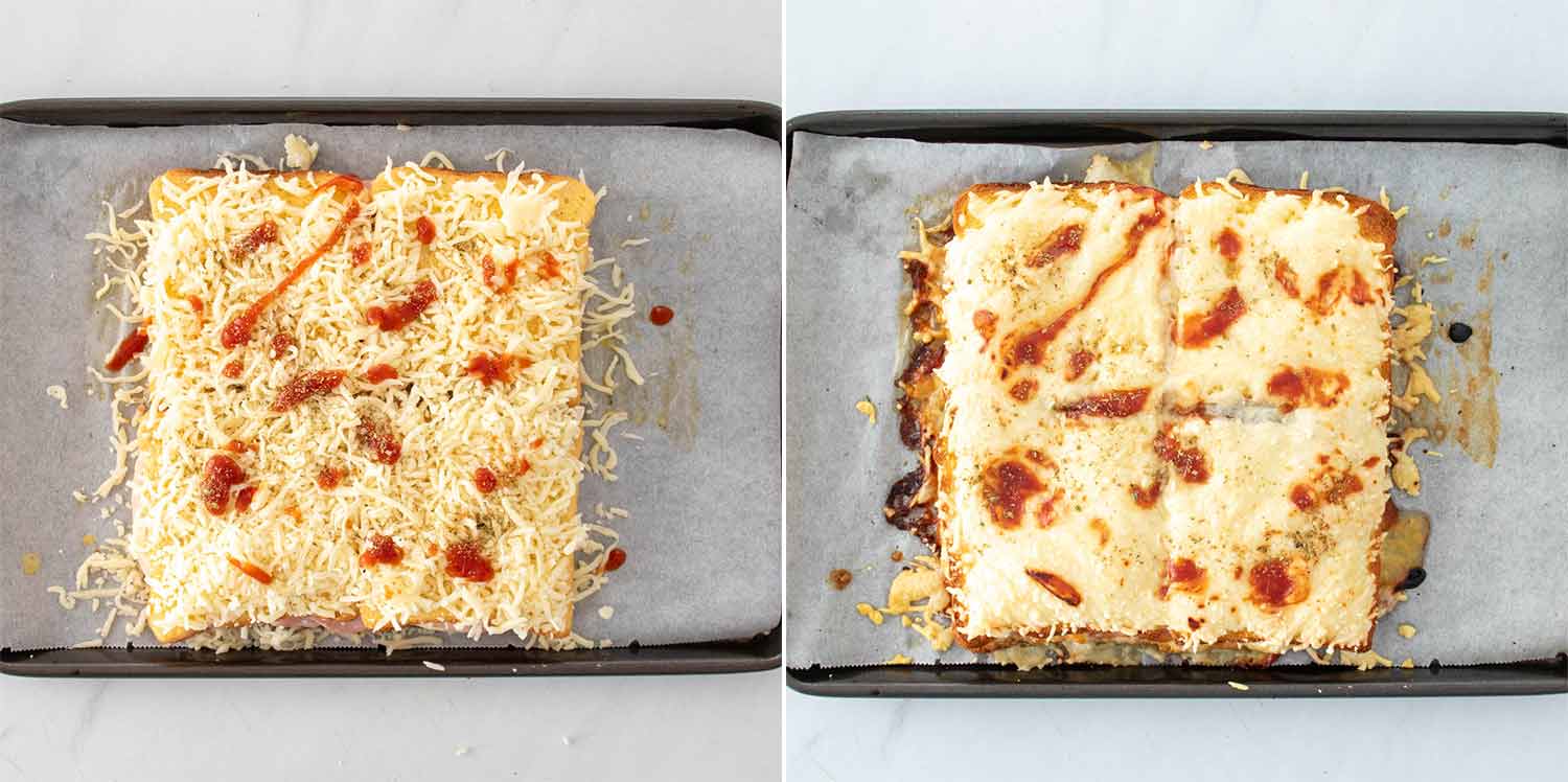 - Așază 4 felii de pâine într-o tavă tapetată cu hârtie de copt.