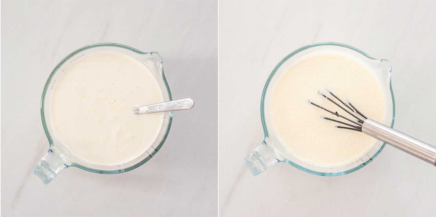 - Amesteca laptele, smantana lichida, laptele condensat si vanilia pana devine omogen.