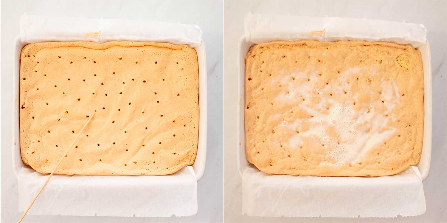 - Inteapa blatul rece cu o furculita sau frigaruie. Toarna treptat siropul peste blat, lasand sa se absoarba.