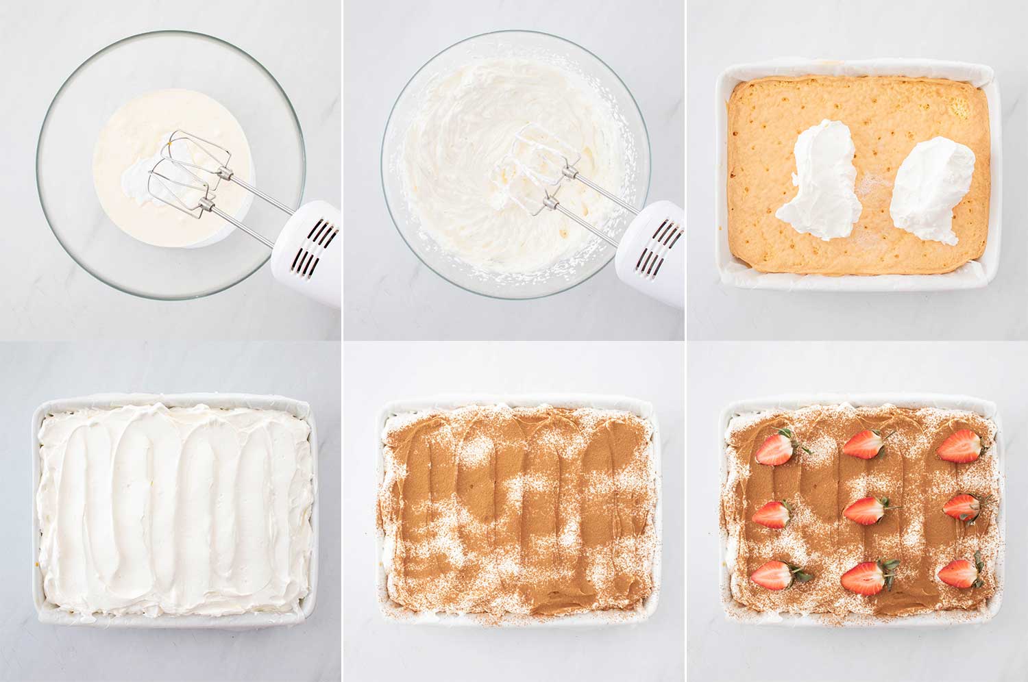 ORNEAZA : Bate frișca rece cu zahărul pudră într-un castron și întinde-o uniform peste prăjitura răcită și însiropată. Decorează apoi cu scorțișoară, fructe proaspete sau fulgi de cocos, după preferință, pentru un aspect festiv și apetisant.